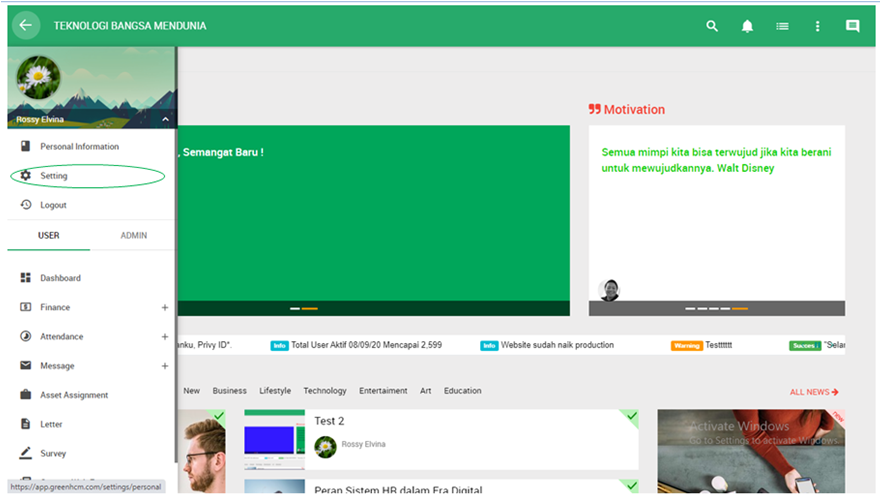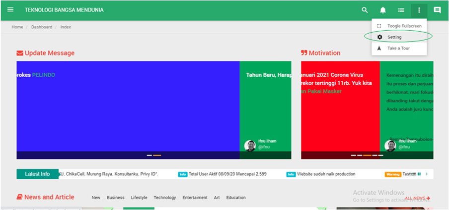Anda dapat mengakses menu Setting melalui 2 cara yaitu yang pertama dengan mengklik tanda dropdown yang ada disamping nama pengguna dan pilih Setting.