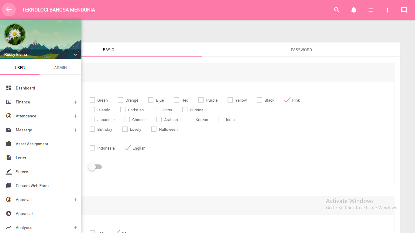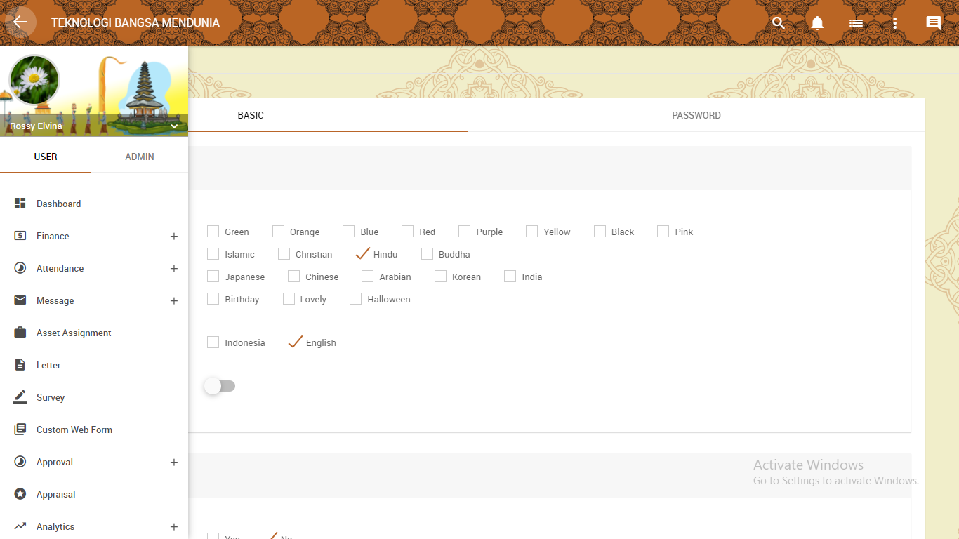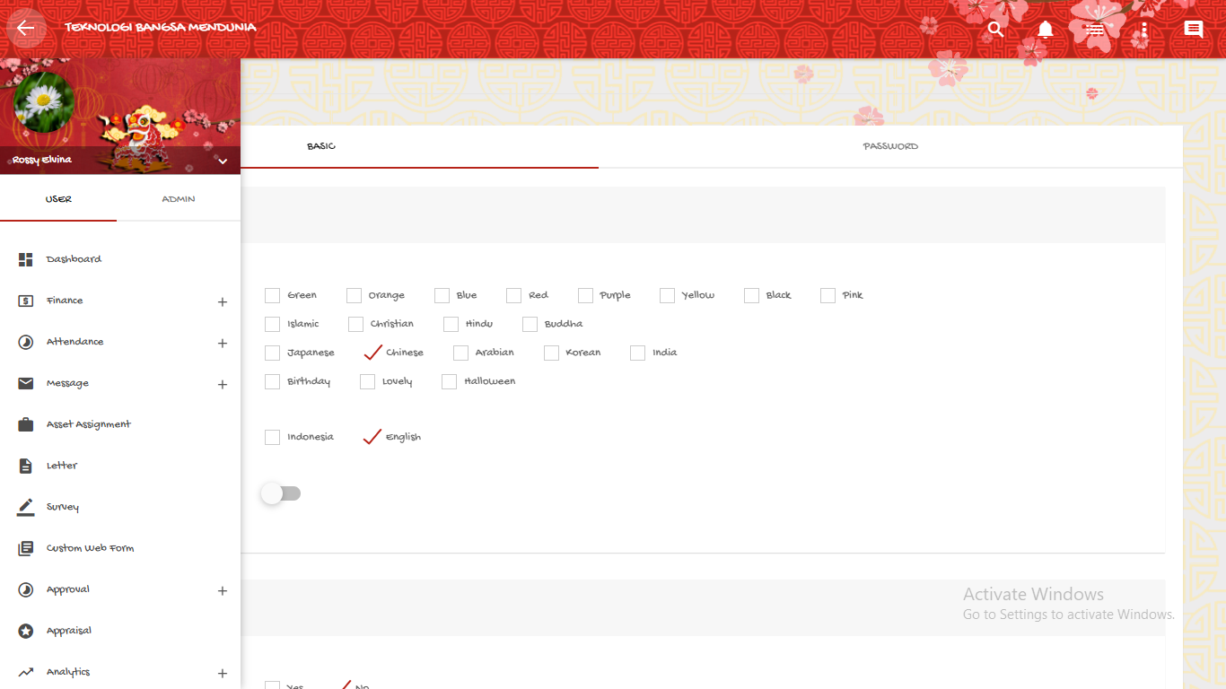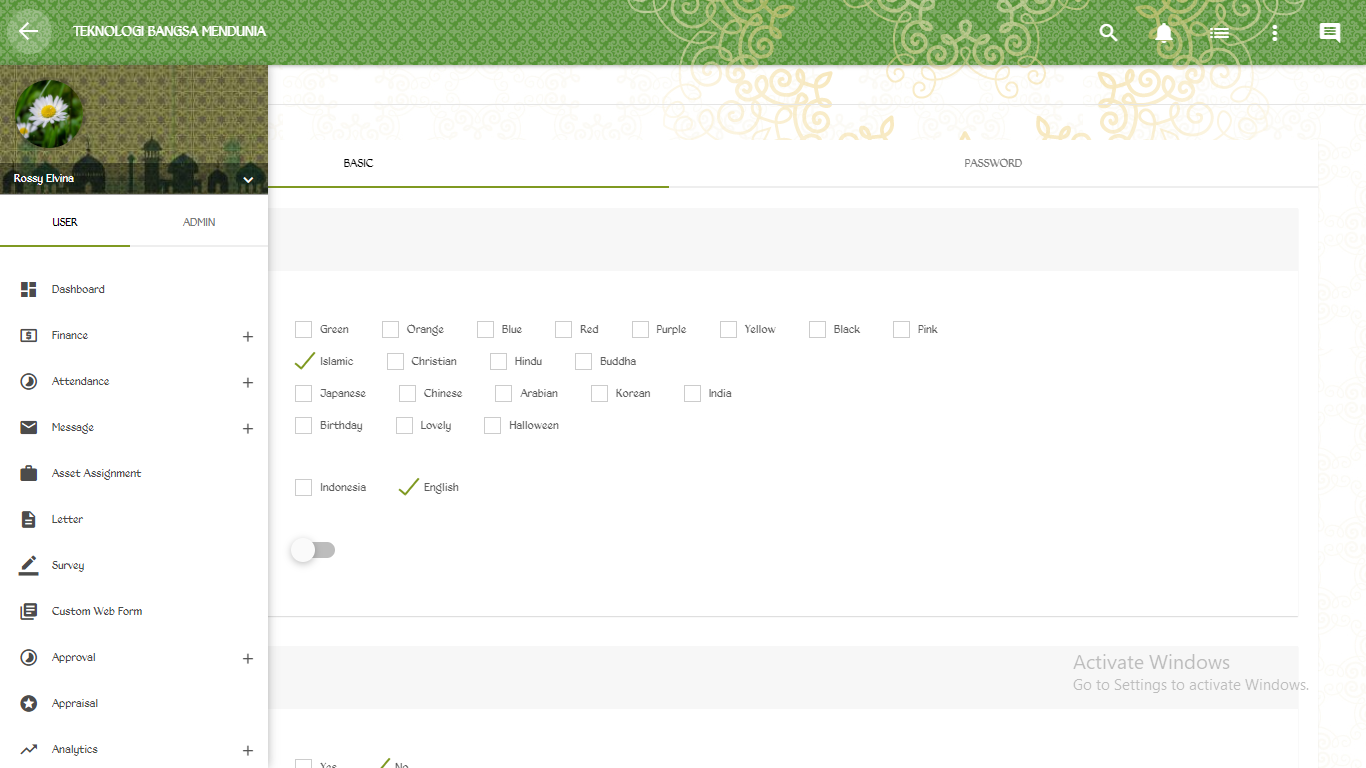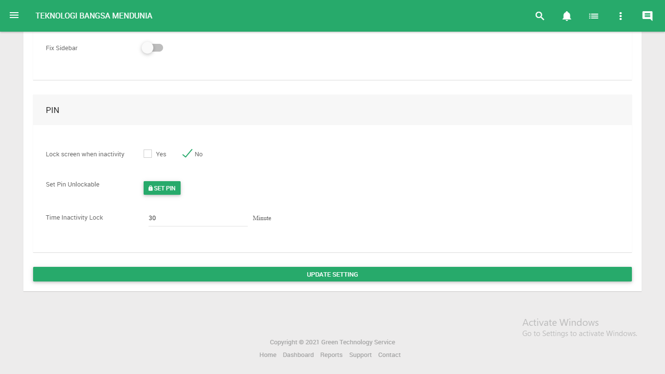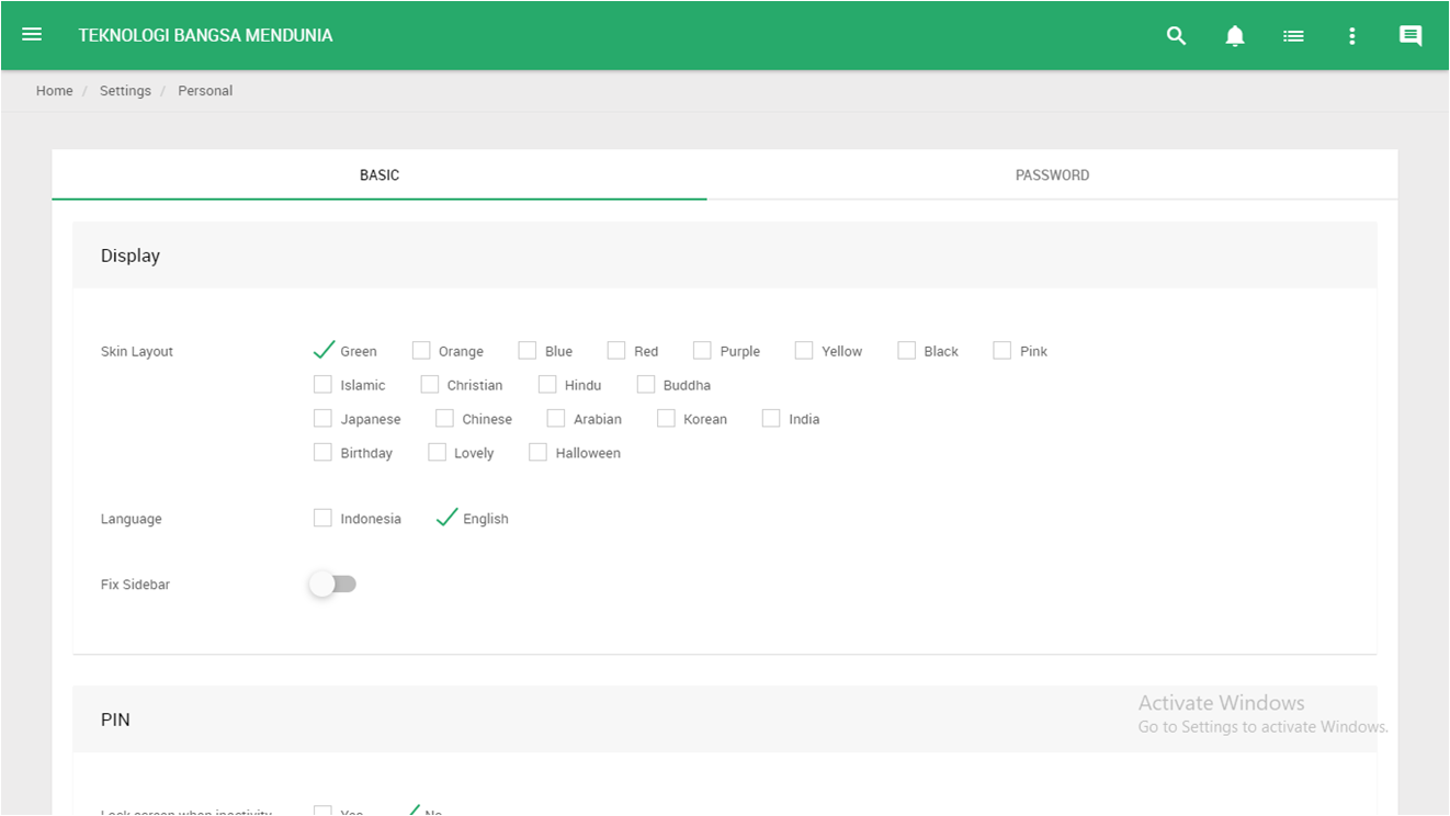 Menu Setting berfungsi untuk melakukan perubahan pada tampilan tema, bahasa, dan kata sandi.